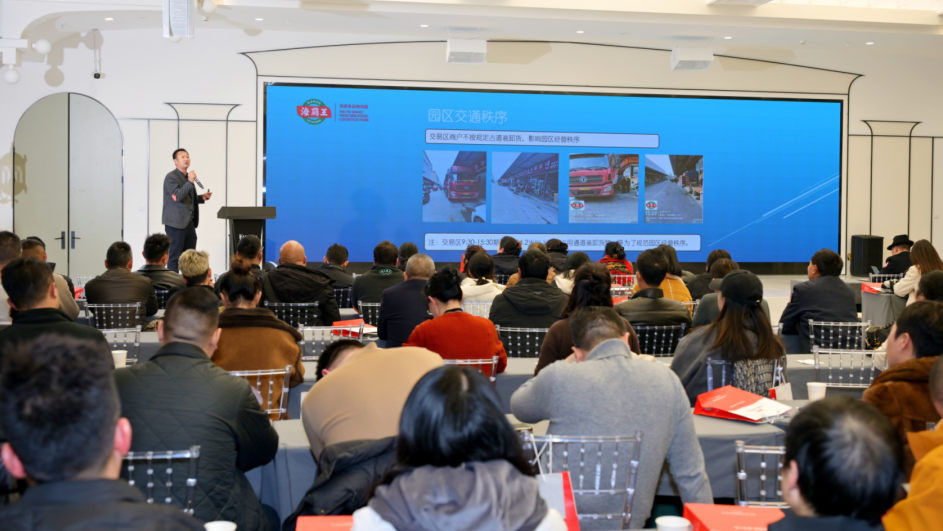 下午 3 时许,栋长会率先在二楼金海湾厅启动。市场服务中心负责人作 2025 年度栋长工作总结报告,全面回顾了栋长日常巡检、商户管理、突发事件处理等工作成果。报告显示,2025 年栋长团队累计排查消防隐患、占道经营、索证索票不全等问题,有效保障了园区经营秩序。现场还为年度优秀栋长颁发荣誉,激励大家继续发挥 “园区治理毛细血管” 的作用。